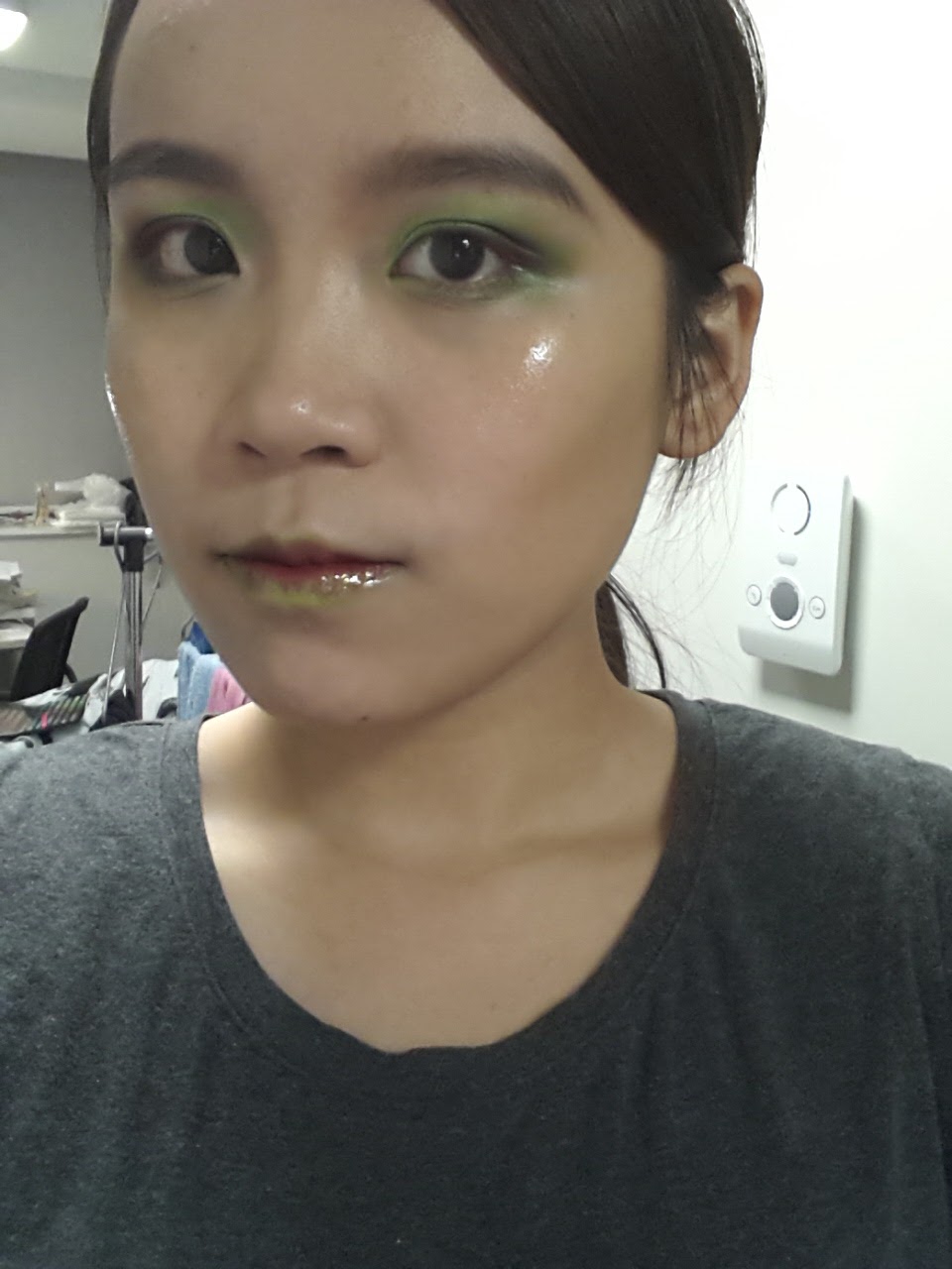 For design 1, I have mainly focus on the idea of using green and red which shows the flytrap's color. I have used a green eye shadow on both lids first and then add the dark brown color on the outer v areas to create depth on the eyes. I have used the dark red color from the supracolor palette and brush the upper lashes with the color and the disposable mascara. To show the brown color of the soil, I have applied dark brown contouring under the cheekbones, side of the nose and also on the forehead area. I have also used a dark brown color for the brows to link to the color of the soil as well and I just used dark brown eye shadow to fill in the brows to remain the original features of the human. For the lip look, I have applied the green color on the lips first and then apply the red color on the inner part of the lips. This reminds me of the color of the flytraps. At the end, I have applied gloss on the cheeks and also on the lips to create the wet look which represents the elements of water.